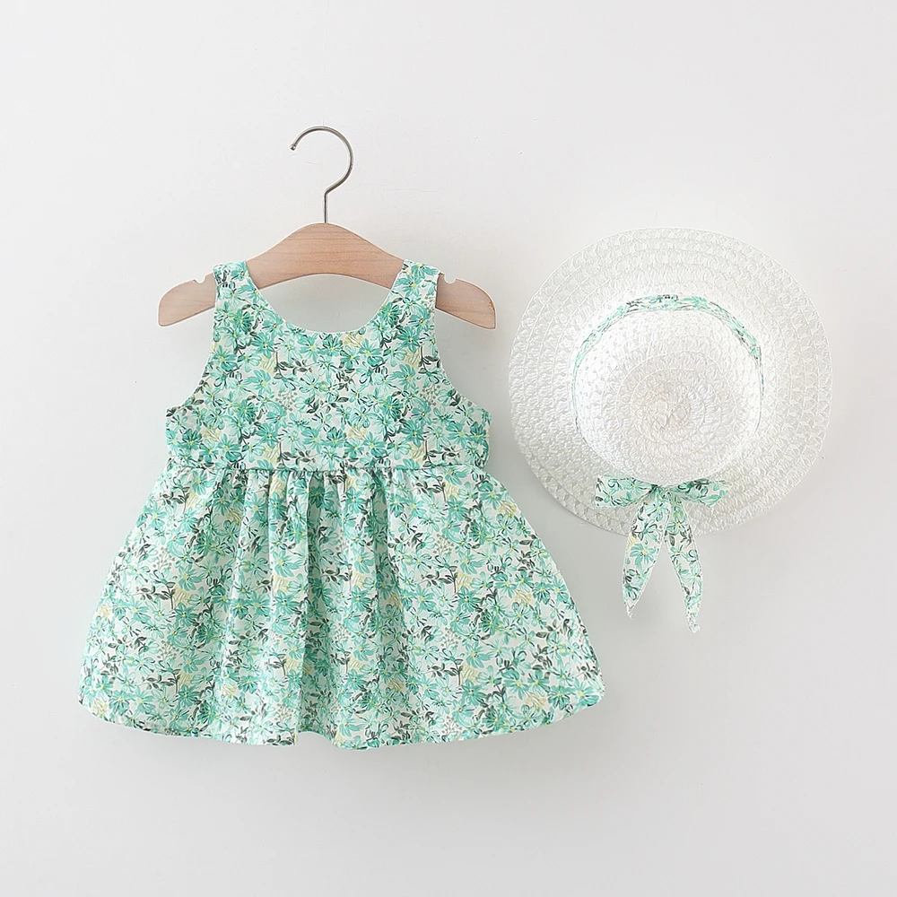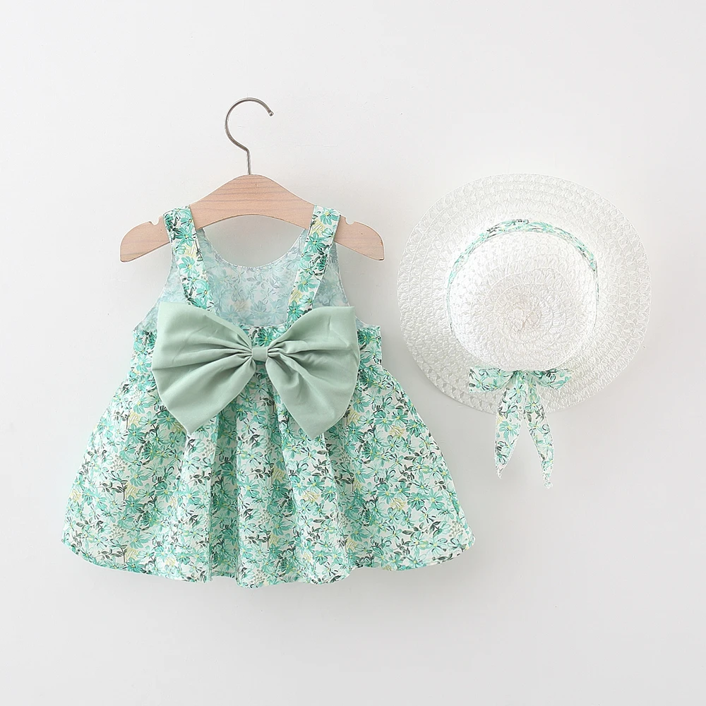 Vestido de bebê de 2 peças de verão + chapéu de sol com alça de laço floral vestido de menina macia e confortável roupas infantis