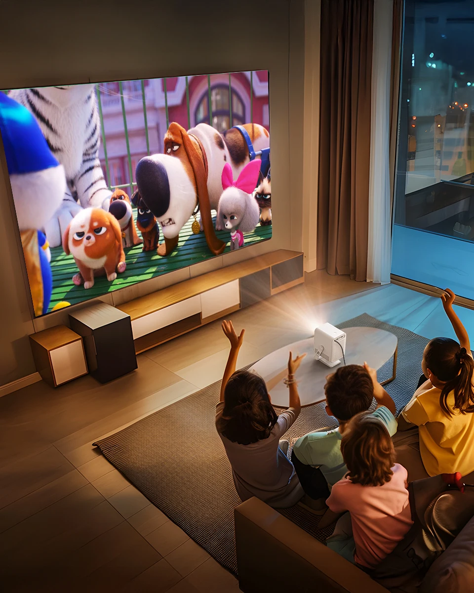 A imagem superdimensionada de 30-150 polegadas traz prazer ao nível de teatro, a imagem pequena de 30 polegadas é adequada para visualização de cabeceira e a 150 polegadas atende às necessidades do teatro da sala de estar, que é multifuncional.