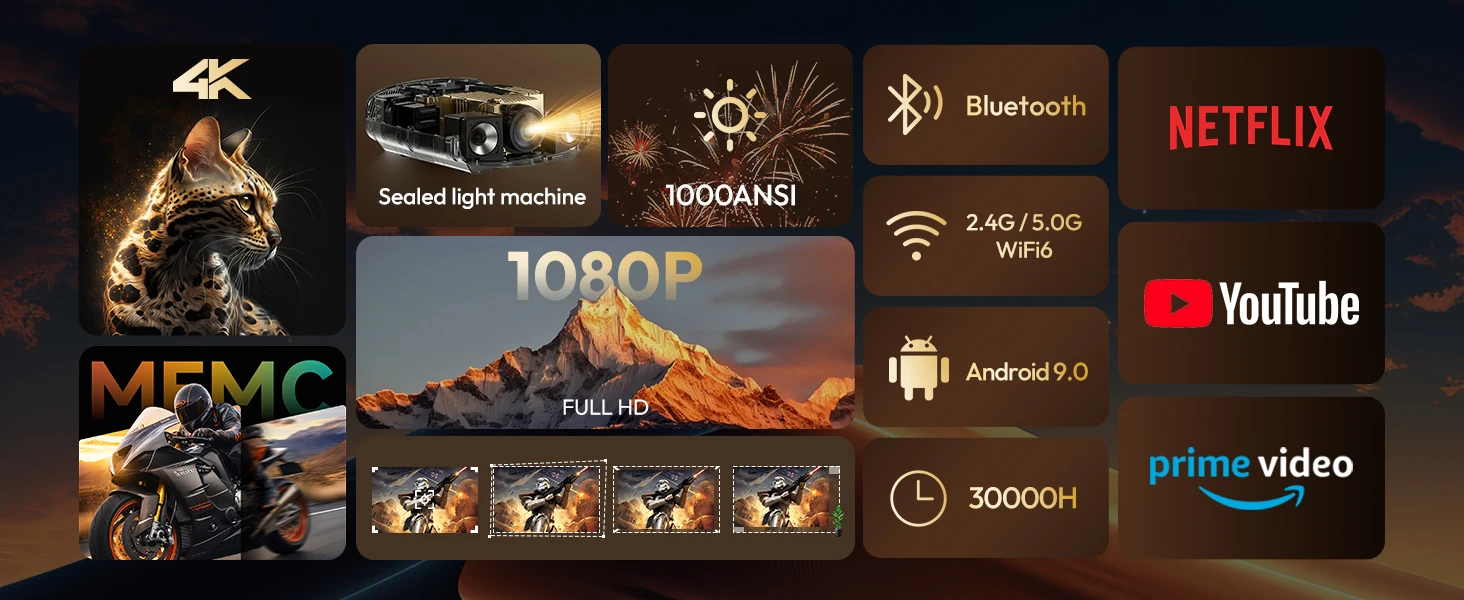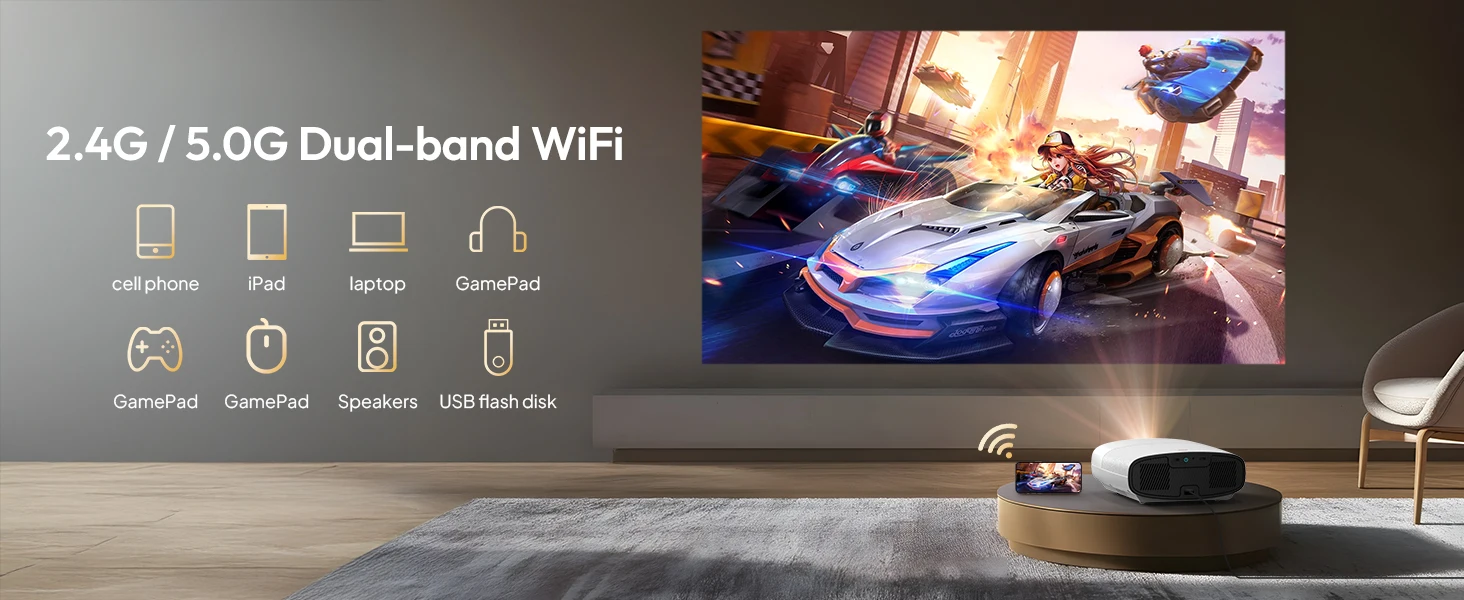 O projetor nativo 1080P apresenta qualidade de imagem HD real, cada quadro é exibido com precisão através da resolução física de 1920 x 1080 pixels, em comparação com compressão ou interpolação para obter pseudo-HD, pode trazer desempenho mais detalhado, reprodução de cores mais realista e dinâmica mais suave imagem, seja assistindo filmes, eventos esportivos ou tela de jogos, você pode experimentar nível de cinema irregular e sem desfoque. O efeito visual é de qualidade de teatro, sem irregularidades ou desfoque.