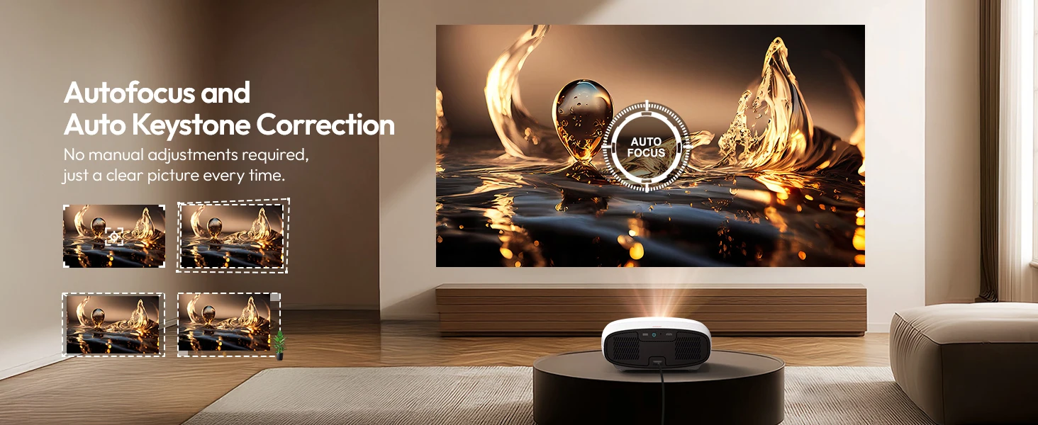 A função de foco automático e calibração automática do projetor libera completamente as mãos do usuário, apresentando instantaneamente uma imagem nítida, quadrada e perfeita.Quer se trate de projeção lateral, movimentação ou ajuste do ângulo, o sistema pode calibrar de forma inteligente em tempo real, despachando adeus às tradicionais e pesadas etapas de calibração manual, de modo que cada vez que você a usa, é tão simples e eficiente quanto uma TV inteligente, e ele realmente realiza uma experiência de nível de cinema com limite zero.