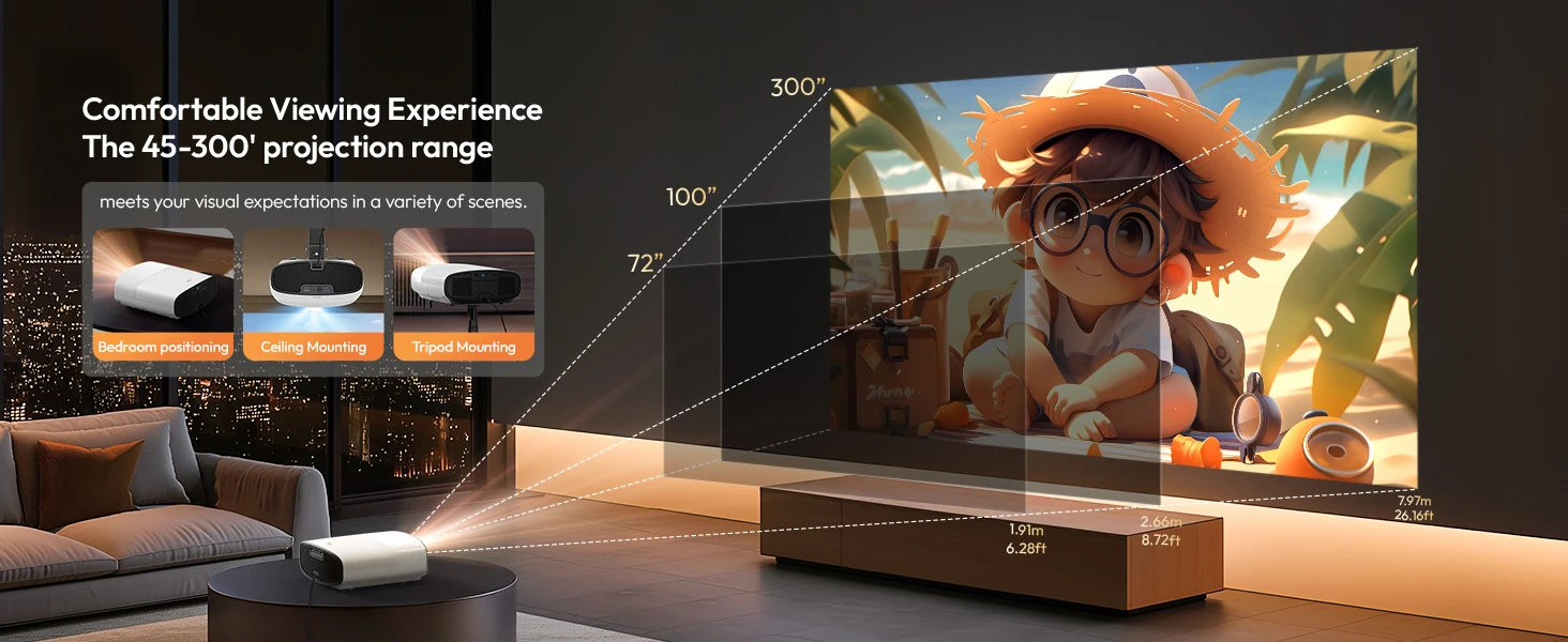 Adapte seu cinema ao seu espaço.O A22 preenche facilmente telas de 72 polegadas envolventes a 300 polegadas verdadeiramente enormes, transformando qualquer ambiente em um teatro pessoal.Seu design versátil proporciona total liberdade: coloque-o sobre uma mesa para diversão instantânea, monte-o no teto para uma configuração permanente de teatro ou conecte-o a um tripé padrão para obter a altura de visualização perfeita.Essa flexibilidade incomparável garante que você obtenha a experiência perfeita de tela grande, independentemente do layout ou da preferência do seu quarto.