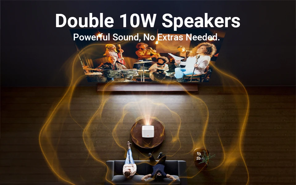 Projetor duplo de sistema de áudio e subwoofer integrado para trazer um som surround estéreo chocante, dois alto-falantes de alta fidelidade para garantir uma difusão de som equilibrada, com unidade de baixa frequência ajustada profissionalmente, não só pode restaurar claramente os detalhes do diálogo, mas também apresentar um explosões e efeitos musicais profundos e poderosos, sem a necessidade de áudio externo para desfrutar de uma experiência de áudio e vídeo envolvente comparável à do teatro.