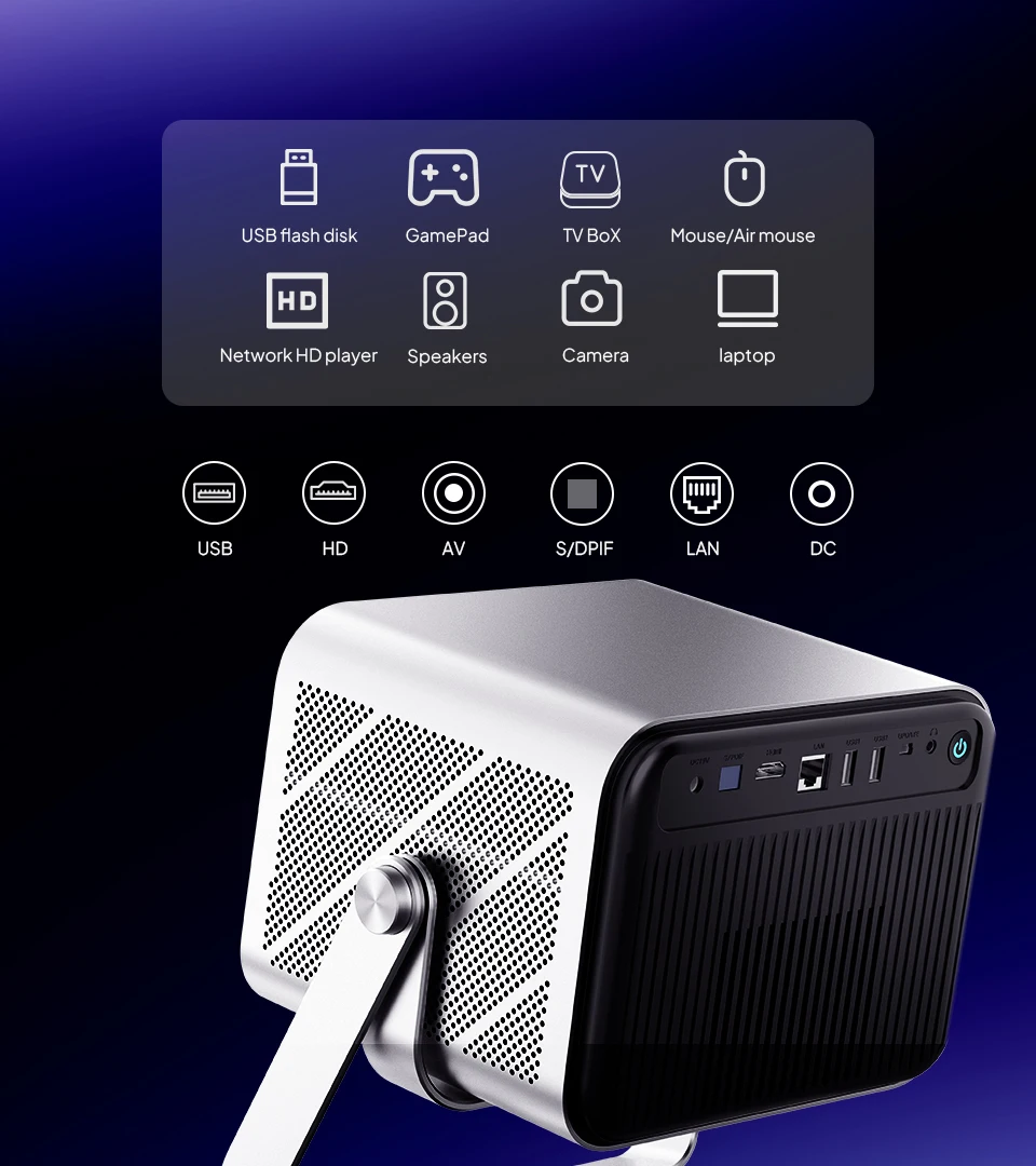Os graves premium integrados aprimoram sua experiência de visualização, proporcionando um som profundo e de qualidade de teatro que dá vida a filmes e jogos.A poderosa resposta de baixa frequência adiciona intensidade a explosões, música e cenas de ação, criando áudio envolvente que combina com os visuais impressionantes do projetor, sem necessidade de alto-falantes externos.