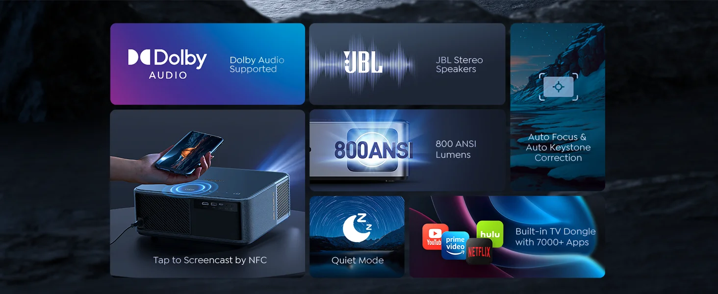 ✯ Entretenimento Inteligente: Tecnologia NFC exclusiva!Este projetor 4K oferece projeção simplificada com um simples toque.Ele combina conveniência e precisão com projeção de tela NFC para conectividade perfeita.