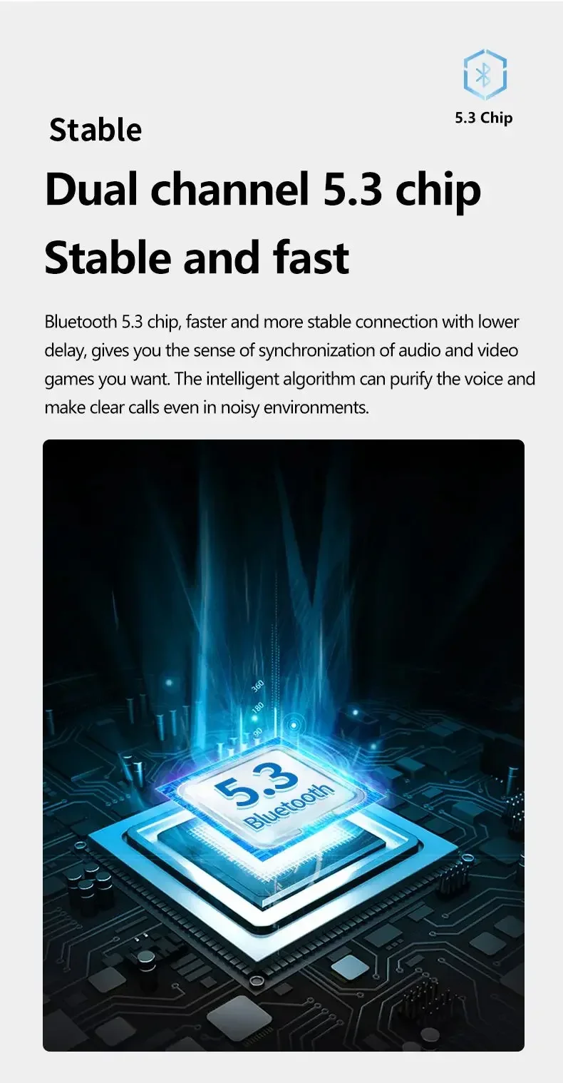 O chip Bluetooth 5.3, conexão mais rápida e estável com menor atraso, oferece a sensação de sincronização dos jogos de áudio e vídeo que você deseja.O algoritmo inteligente pode purificar a voz e fazer chamadas claras, mesmo em ambientes barulhentos.