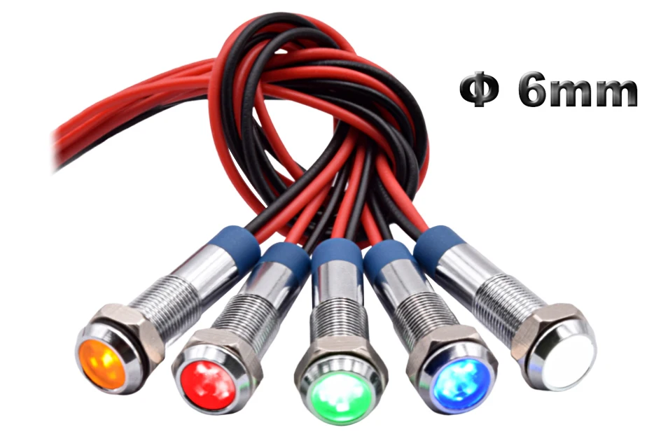 YIDI 5/10pcs 6mm LED Metal Indicador Sinal Lâmpada 6V 12V 24V 220V DC AC Cabeça Plana Fio Levando Luz Piloto Vermelho Verde Azul Âmbar Luzes Indicadoras Brancas para Motocicleta